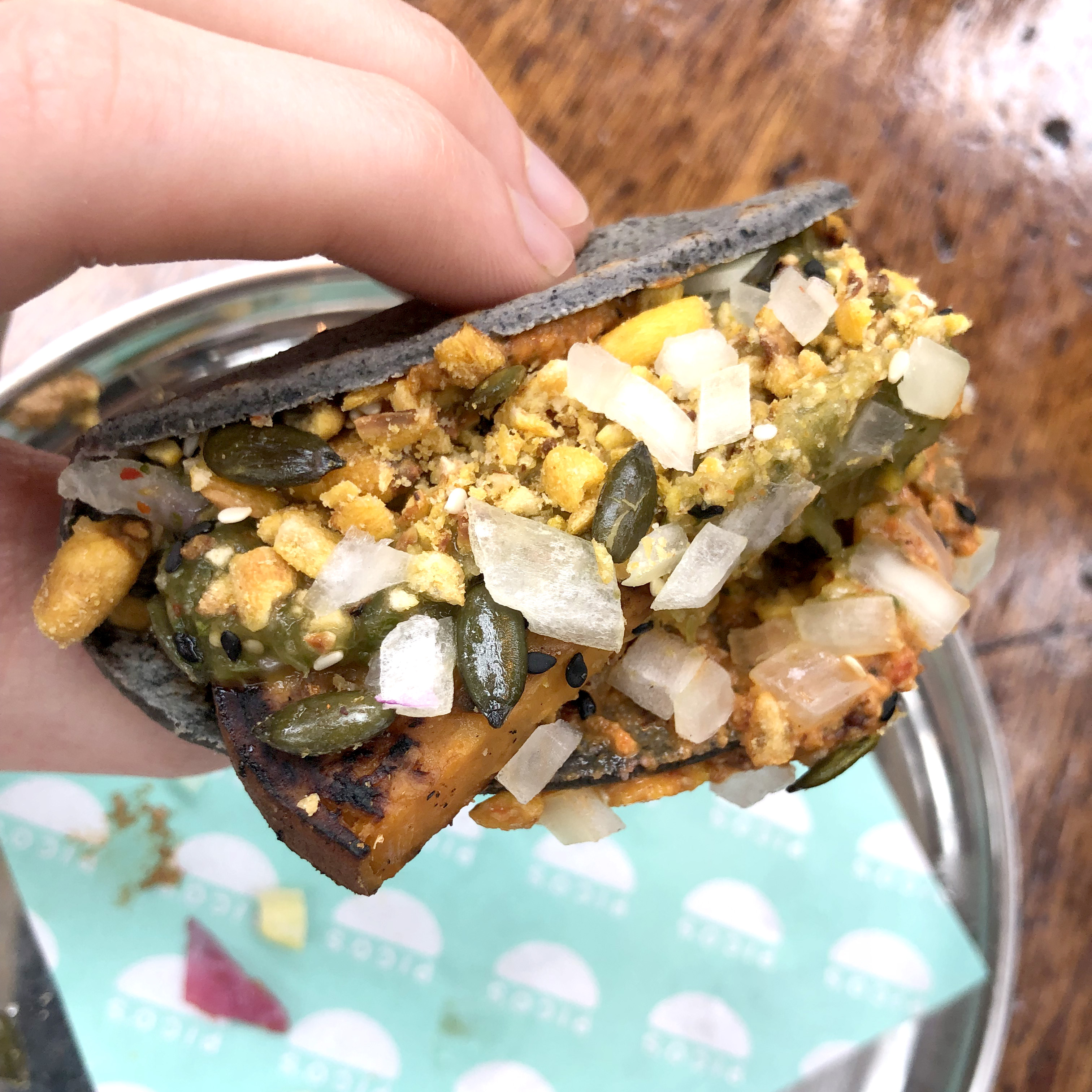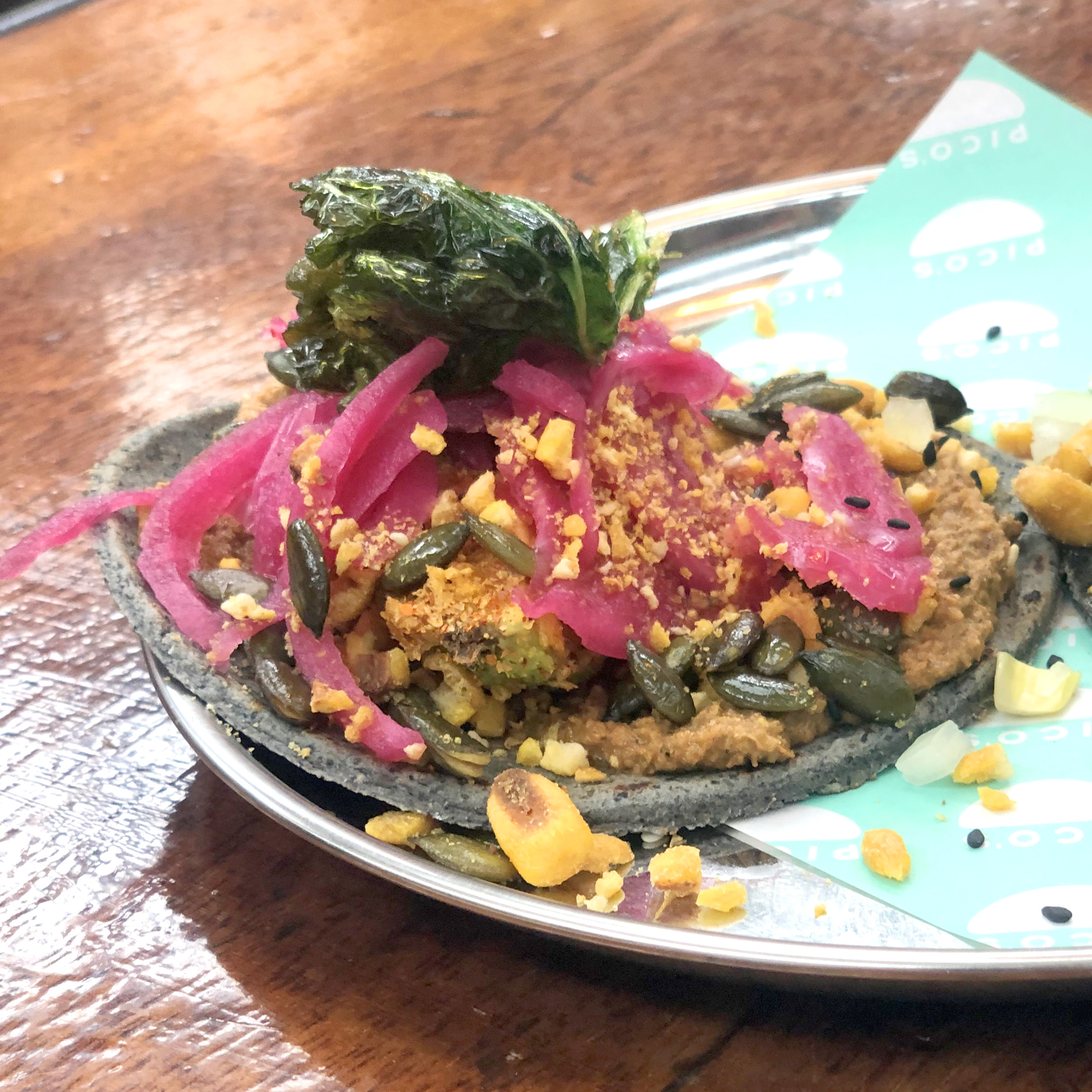 There’s more of the smoked almond salsa on the Battered Avocado taco, but if you’re going to get sick of this versatile ingredient – it certainly won’t be on your first visit. The avo plate is just as well rounded as the other dishes, with red onions in pickling liquid that develop the creamy avocado flavour into something three dimensional. Pieces of crispy kale and batter muscle through the smoothness and add a very pleasing texture in amongst the tortilla, the pepitas offer further textural contrast and flavour. Every bite is sharp and exciting.