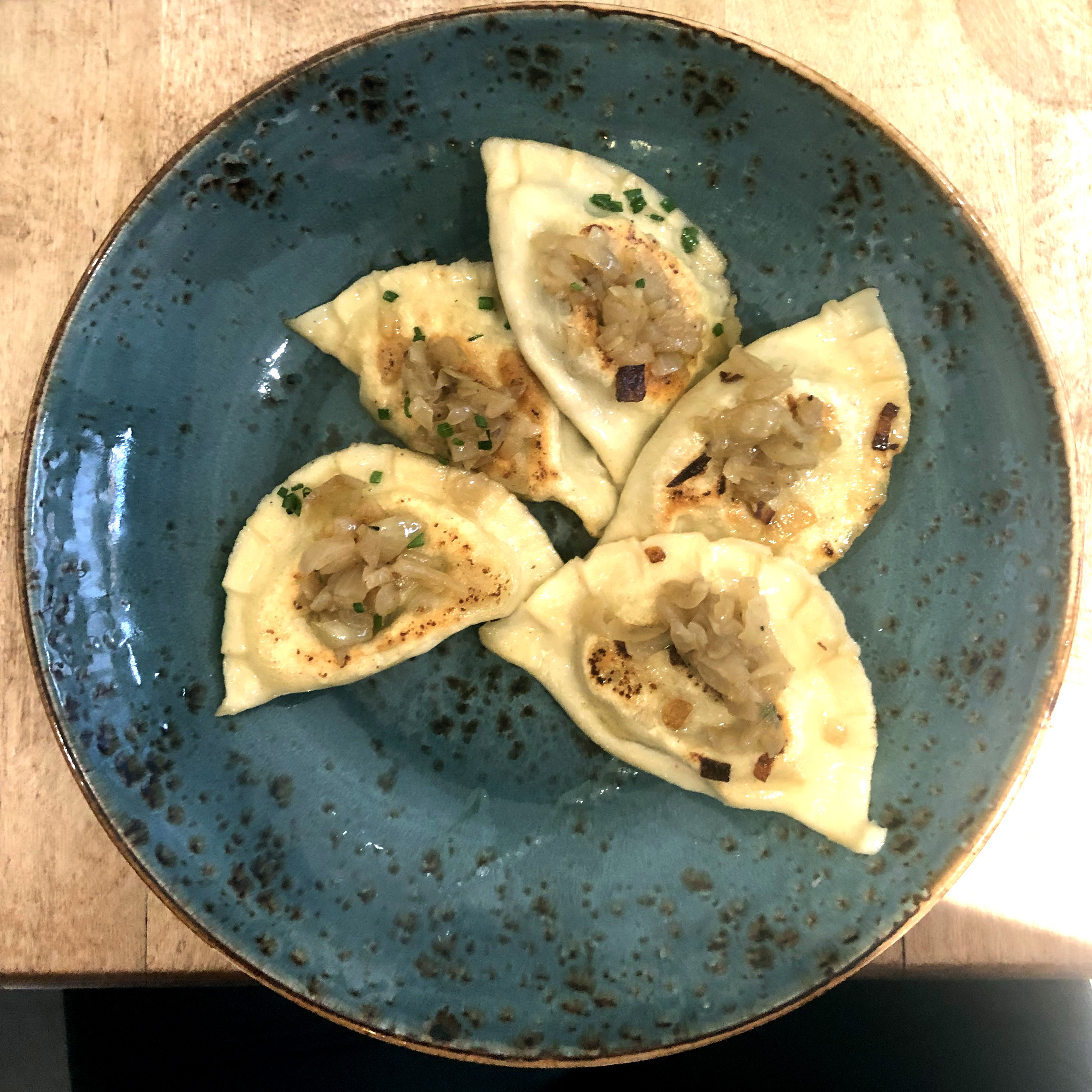 Vegan options on the menu are slim, plenty of ovo-lacto vegetarian options are available, along with a few meat dishes. I was helpfully informed that as a vegan diner I could order focaccia straight out of the oven (£2.50), along with sauerkraut and mushroom pierogi (£6.50), a variety of salads (£2-3) and an extra serving of sauerkraut as it comes (£3). My server filled me in on details about the drinks on the menu, brought out a plentiful bottle of water for the table and promised that more vegan options were on their way as the seasonal menus change – when Beetroot’s time in the sun comes, the menu will be a real treat for herbivores, I hear. I order focaccia, the perogies and a Swiss lager that I’ve never seen in England before.
